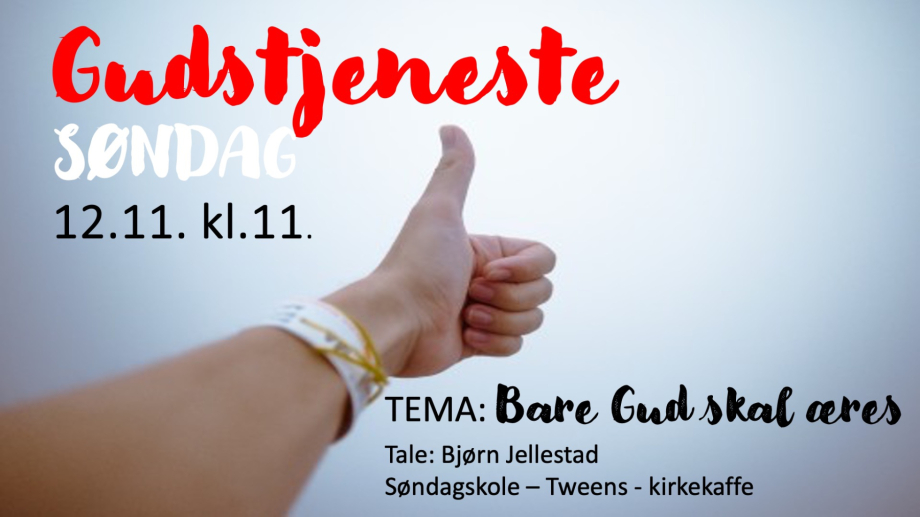 Gudstjeneste Arrangement Dato Søndag 12. november 2023 Tid kl. 11:00 - 12:30 Lagre i kalender Tema: Bare Gud skal æres. Tale: Bjørn Jellestad. Søndagskole, Tweens og kirkekaffe