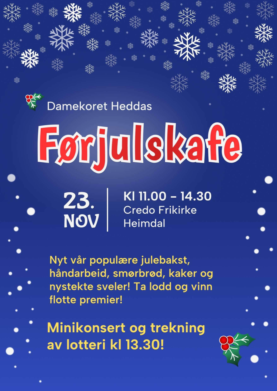 Lørdag 23. november har en av våre leietakere, Damekoret Hedda invitert til Førjulskafe i Credos lokaler. Åpent for alle.