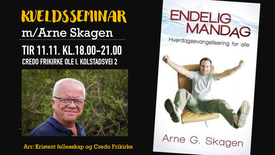 Tirsdag 11.november får vi besøk av Arne Skagen som mange vil huske fra menighetshelgen. Dette blir en flott anledning til å bli inspirert av hans store hjertesak som handler om hverdagsevangelisering.