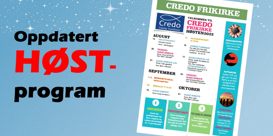 Noen mindre endringer i høstprgrammet for november og frem mot jul finner du her på hjemmesiden og i papirutgaven som du kan ta med deg fra gudstjenesten i Credo.